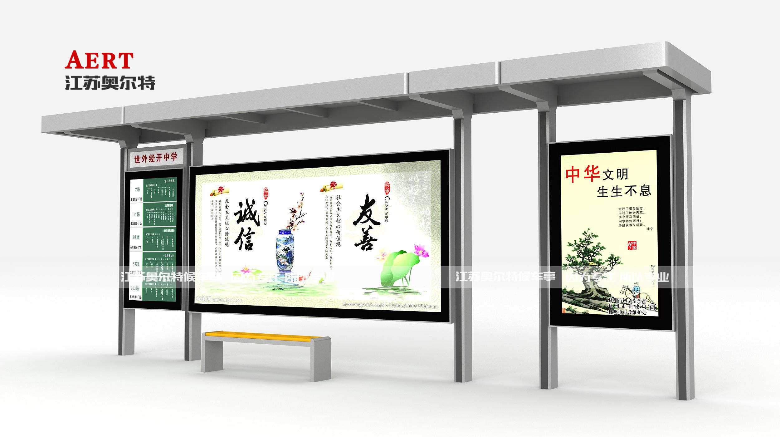| 候(hòu)車亭尺寸 | 一大一小尺寸:寬7米,高2.9米,寬1.5米 二大一小尺(chǐ)寸:寬12米,高2.9米,寬1.5米 三大一(yī)小尺寸:寬17米,高2.9米,寬1.5米 標準大燈箱尺寸:寬3.65米,高1.8米 標準小燈箱尺寸:寬1.2米,高1.8米(mǐ) 注:可根據(jù)客戶需求進行定製,采用模塊(kuài)化設計,組合方式靈活(huó)多變。 |