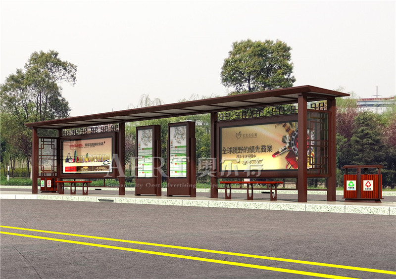 3.鋁合金候車(chē)亭,這種候車亭是采(cǎi)用鋁合金型材和(hé)不鏽鋼(gāng)的巧妙組合,考慮(lǜ)到強度問題,通常立柱采用(yòng)不鏽鋼(gāng),燈箱和頂棚采用(yòng)鋁合金型材,製作完成(chéng)後整體外(wài)觀經高(gāo)溫靜電噴塑處理或氟碳烤漆,通常為兩色搭配,整體外觀十分(fèn)美觀(guān),總體造價介於不鏽鋼候車亭及鍍鋅候車亭之間,故這種候車亭將是未(wèi)來發展的方向。