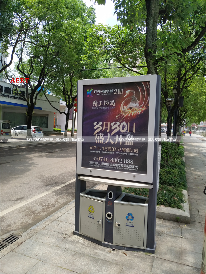 垃圾箱設置:將垃圾箱與公交車站台設置到一起可以(yǐ)使人們更方便的找到垃圾箱。公交車(chē)站台作(zuò)為一個等候場所,人流量也會比較大(dà),產生的垃圾同(tóng)樣會比較多,設置垃圾(jī)箱可以保證城市衛生。廣(guǎng)告垃圾箱便能夠讓人不由升起保(bǎo)護的(de)心理(lǐ),能夠使得我們在(zài)扔垃圾時變得沉穩,而不再是隨手(shǒu)一扔,其多樣化的造型更能讓我們不至(zhì)於產(chǎn)生感(gǎn)觀(guān)的疲勞,並且在其執行垃圾箱(xiāng)的功能同時,更(gèng)能為一個城市(shì)帶來不少的廣告收益,能夠為企業產品的推廣宣傳作極大的促進(jìn)作用。對於城市的環保建設(shè)和經濟發展都有著(zhe)積極的影響(xiǎng)。