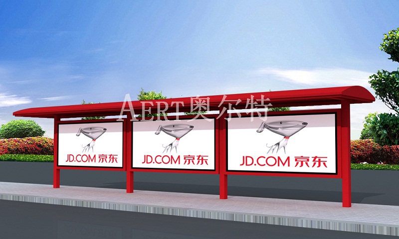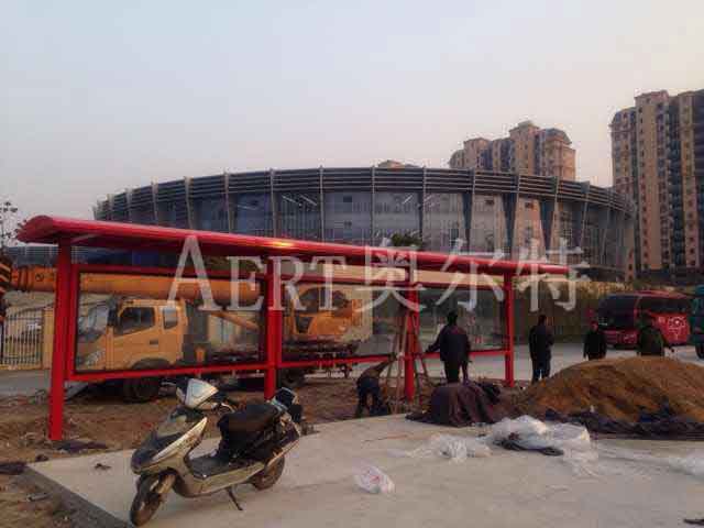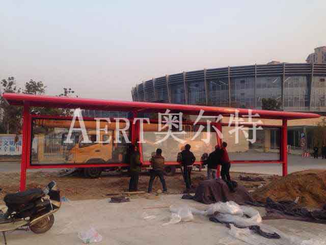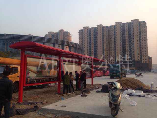 京東新款大紅色候車亭安裝現場