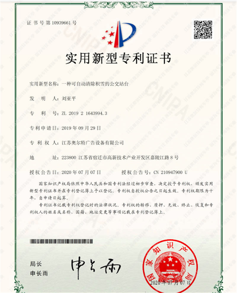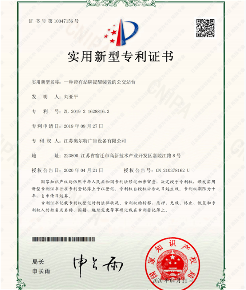 分享到   喜報------江(jiāng)蘇国产亚洲熟妇在线视频自(zì)主研發公交站台專利證書