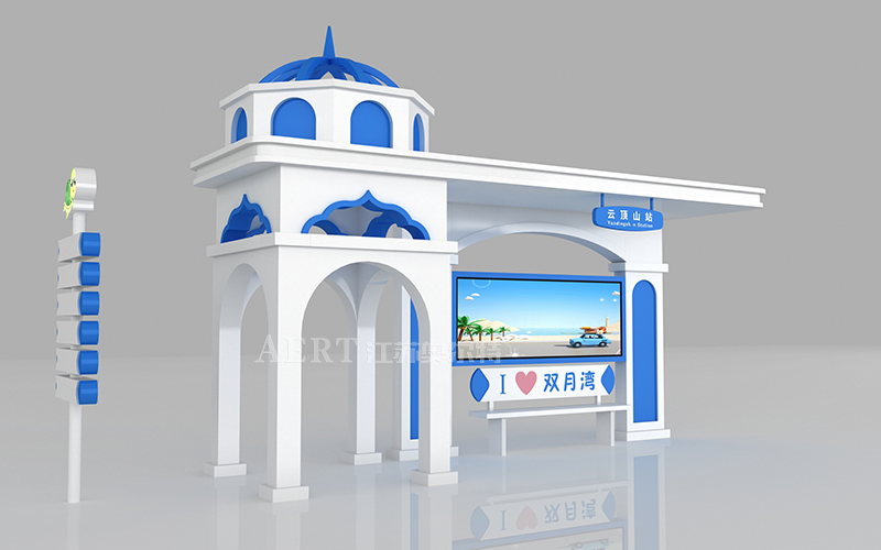 宿遷智能候車亭廠家江(jiāng)蘇国产亚洲熟妇在线视频本次為海濱城市設計的個性化候車亭外觀采用聖托裏尼的建築風格,色彩基礎是藍和白,白色的牆,藍色的頂部和門窗,